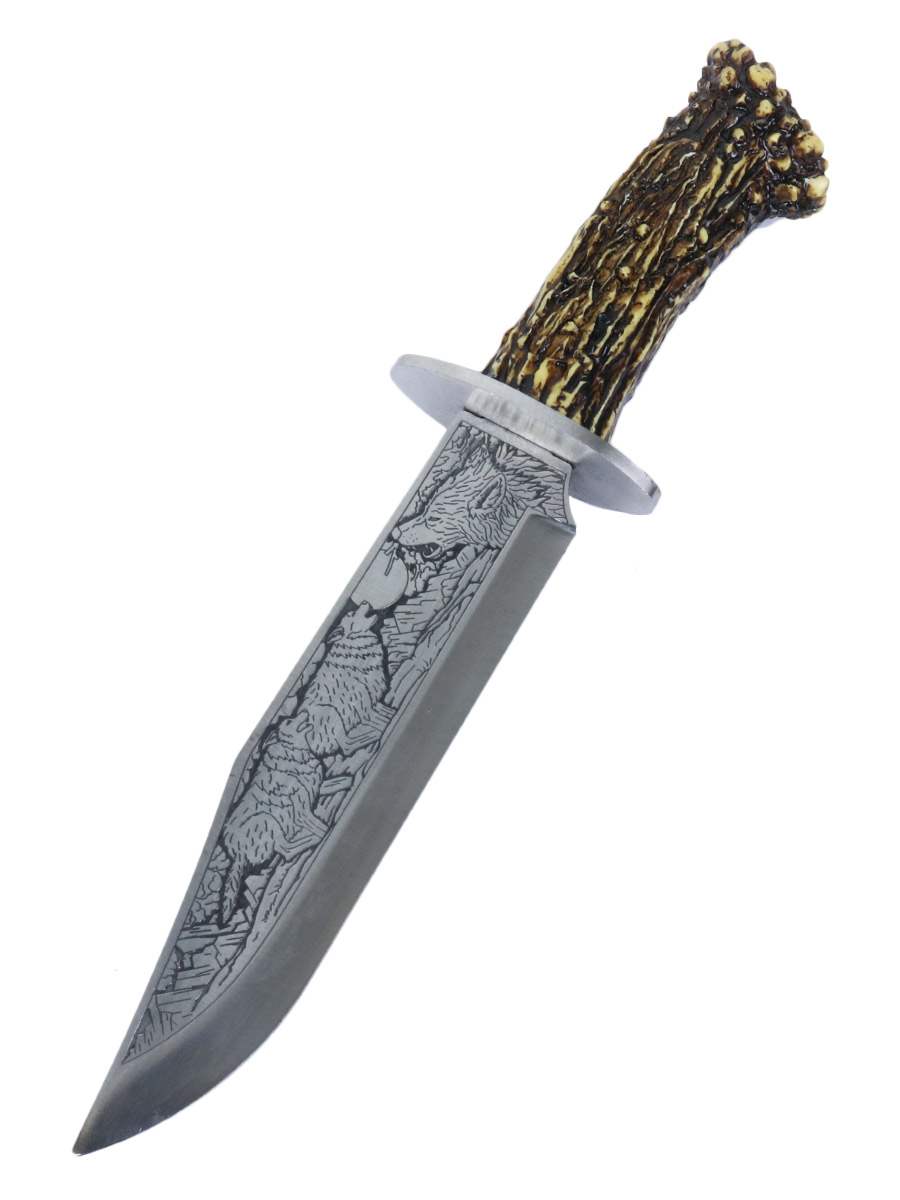 Лезвие затуплено, также выполнено из нержавеющей стали, и украшено выгравированным узором, изображающим стаю волков в лесу.